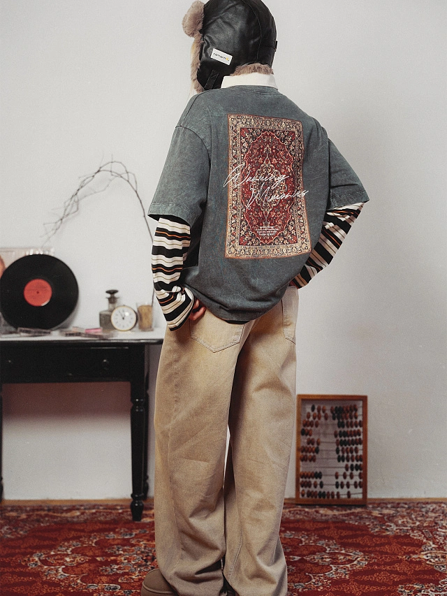 Футболка оверсайз женская серая с принтом винтажного ковра