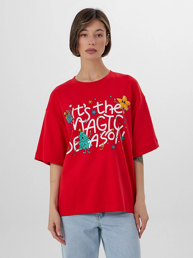 Красная футболка с надписью «It's the magic season» («Время волшебства») создаст праздничное настроение. Модель свободного кроя оверсайз с округлой горловиной и короткими рукавами обеспечивает комфорт.