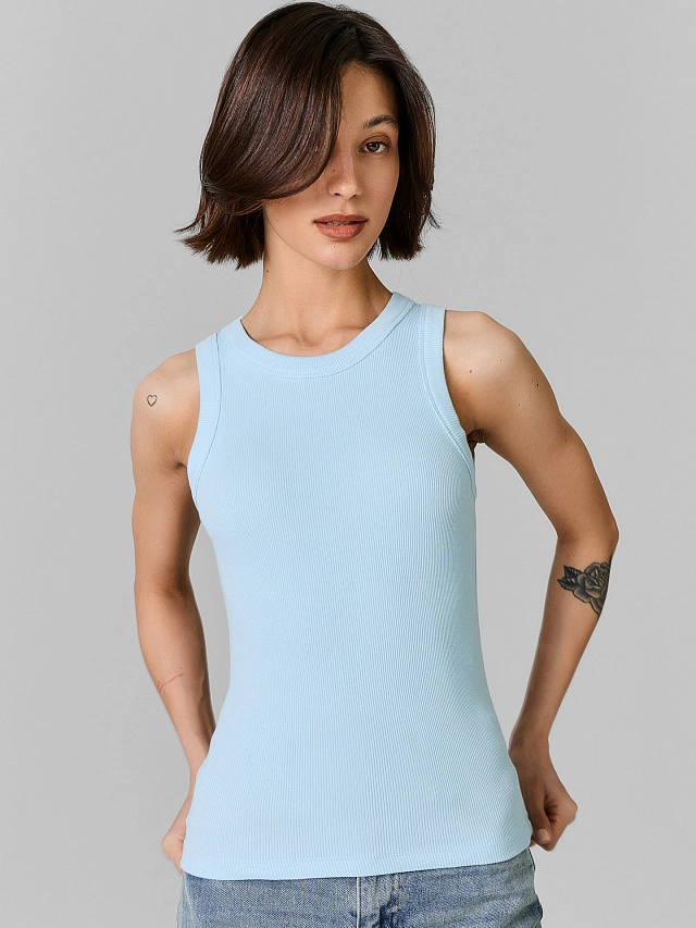 Голубой топ облегающего силуэта — удобная и аккуратная вещь для повседневной носки. Мягко облегает фигуру, не стесняя движений, и подходит для прогулок, встреч и создания базовых образов. Узкое плечо и углублённая пройма добавляют модели лёгкость и открытость.