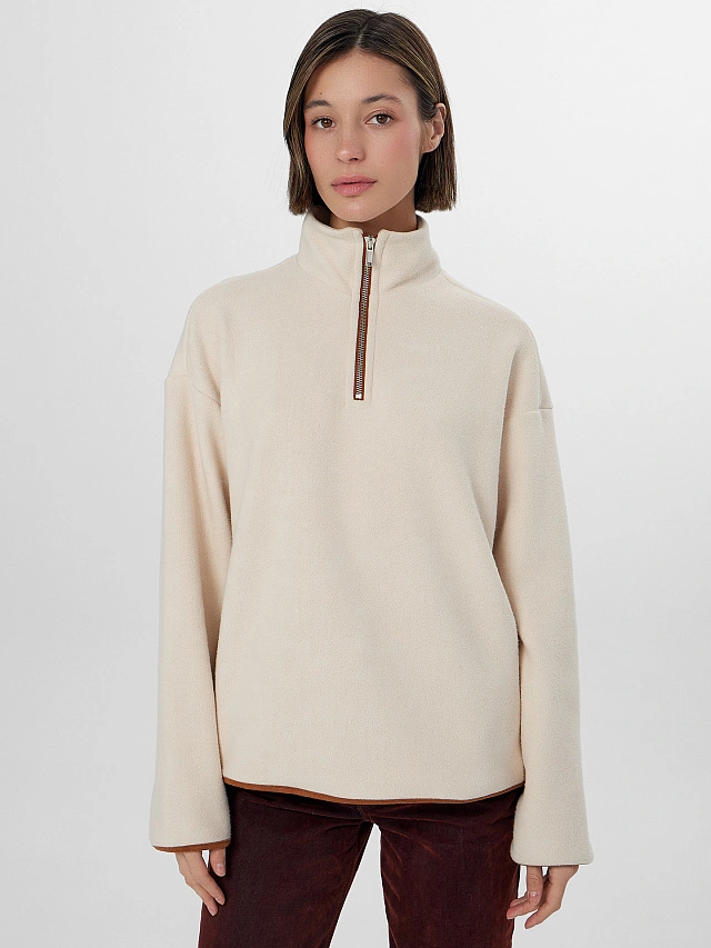 Бежевая женская толстовка из мягкого флиса станет уютным дополнением вашего гардероба. Свободный крой с круглой горловиной и стойкой обеспечивает комфорт в течение всего дня. Застежка-молния по центру и мягкие спущенные плечи создают расслабленный силуэт, не сковывающий движений.