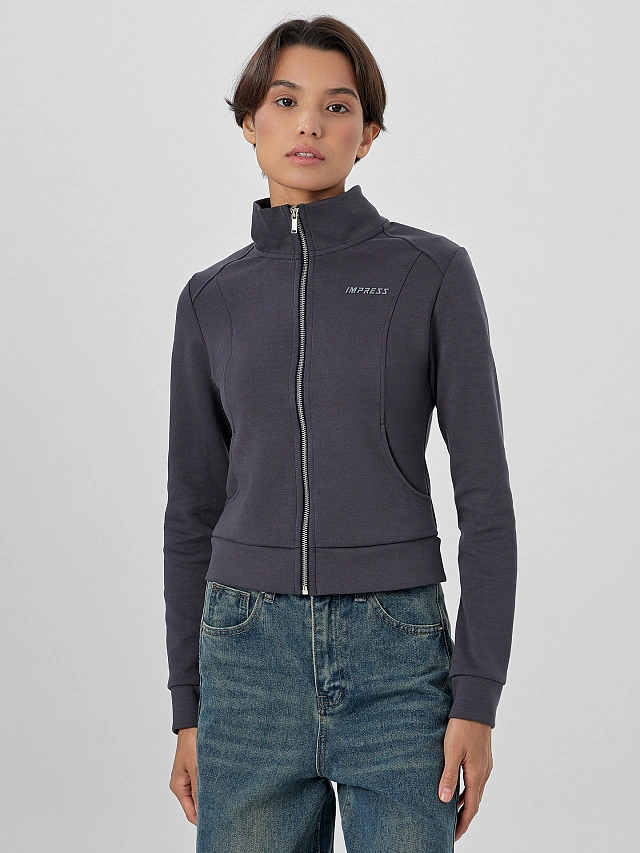 Женская толстовка прилегающего силуэта в насыщенном металлическом сером цвете с мотивирующей надписью «Впечатляй» создана для тех, кто ценит современный крой и внимание к деталям. Модель оснащена удобной застежкой-молнией по центру, которая позволяет легко регулировать степень открытости и создавать многослойные образы.
