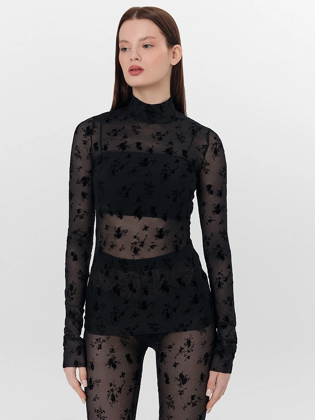 Черный джемпер с цветочным принтом создает стильный и актуальный образ. Прилегающий силуэт из трикотажа с фактурой сетки мягко подчеркивает линии фигуры, создавая эффектную и женственную посадку.