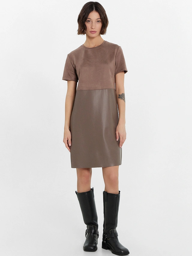 Представляем вашему вниманию эффектное женское платье, которое станет настоящей находкой в вашем гардеробе! Эта модель, выполненная из высококачественного трикотажного полотна "под замшу" в области лифа и "под кожу" (юбка), создаст стильный и уникальный аутфит для любого повода. Имеет прямой силуэт и короткую длину мини, что подчеркивает женственность и элегантность. Круглая горловина придает модели изящный вид, а короткий рукав обеспечивает комфорт и свободу движений. Отрезное по линии талии, оно идеально облегает фигуру, создавая стильный силуэт. Станет прекрасным выбором как для вечерних выходов, так и для дневных мероприятий. Его можно легко сочетать с различными аксессуарами и обувью. Вы обязательно привлечете внимание окружающих и будете выглядеть невероятно привлекательно. Не упустите возможность добавить в свою коллекцию это универсальное платье, которое поможет вам создать множество ярких и запоминающихся образов!